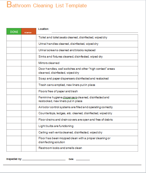 Ceanliness can be a proud factor for any region of business. Be it a dinning cafe, train, aeroplane or a small motel, clean floors, immaculate environment and decent washrooms can add beauty and value to any simple place. The following post contains Free Bathroom Cleaning List Templates (On Commercial level) for your help and assistance. They simplifies all the hectic tasks but also make it seem effortless by guiding and describing minor details. Plus if followed regularly, makes cleaning the area less time-taking and less stressful. See also Inventory List Templates.